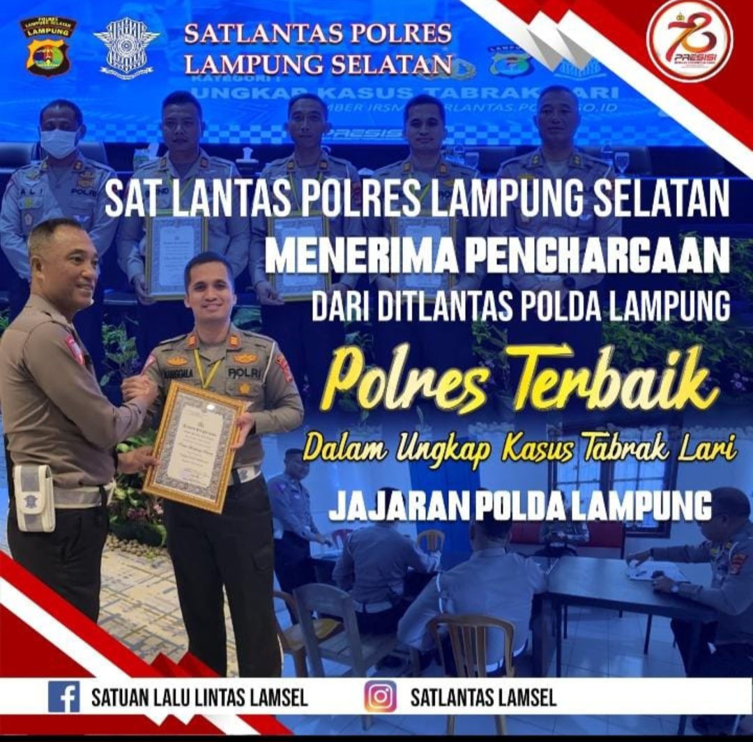 Lampung selatan – Mengungkap Lakalantas tabrak lari di kecamatan Rajabasa, Satlantas Polres Lampung Selatan mendapatkan apresiasi dan penghargaan dari Ditlantas Polda Lampung.