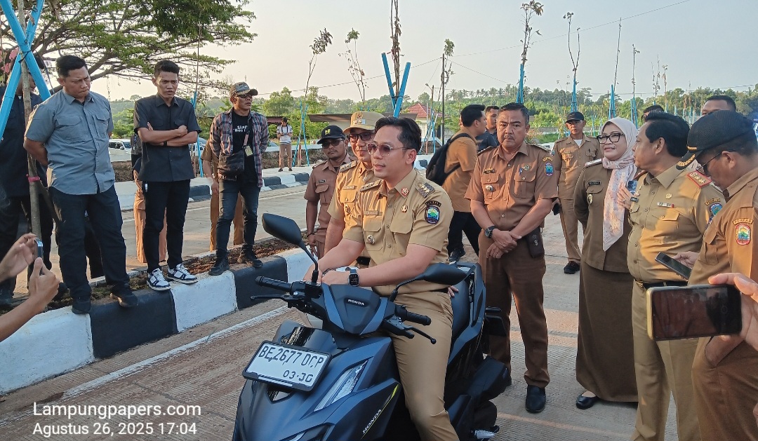 Dalam uji coba jalur tersebut, Bupati Egi memilih cara berbeda: menunggangi sepeda motor. Dari atas kendaraan roda dua itu, ia menyusuri jalan mulus sepanjang 1.680 meter yang diapit hamparan ladang jagung di sisi kiri dan kanan. Di kejauhan, Gunung Rajabasa berdiri megah seakan menjadi saksi perjalanan pembangunan yang bersinergi dengan alam.