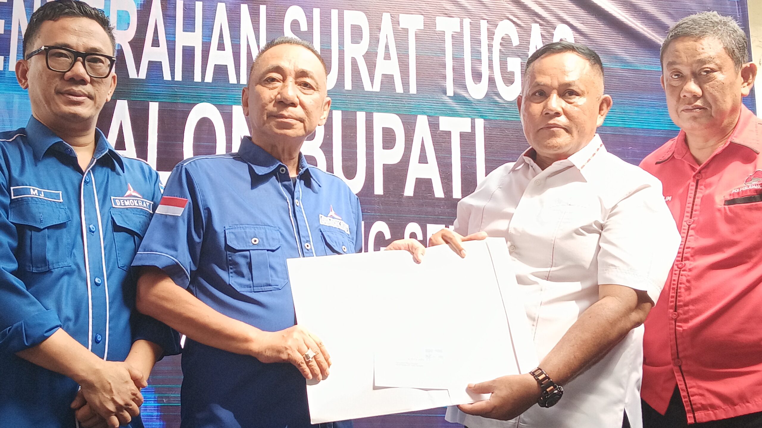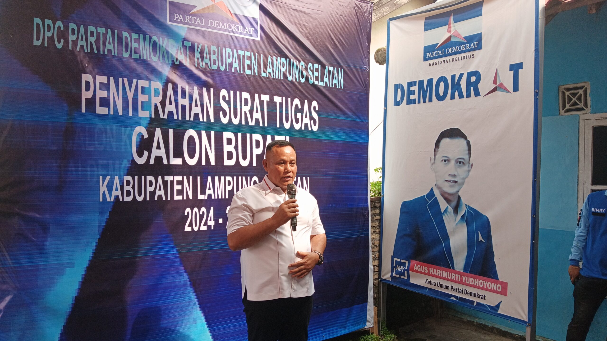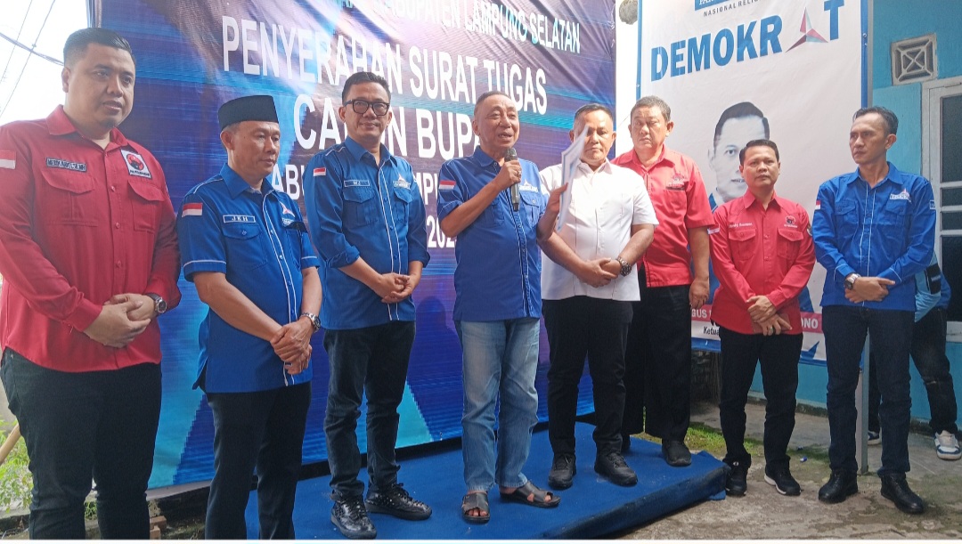 Lampung selatan – Calon Bupati (Cabup) Lampung Selatan dari Partai Demokrasi Indonesia Perjuangan (PDIP), H. Nanang Ermanto menerima surat tugas dari Partai Demokrat. Surat itu diserahkan Ketua DPD Demokrat Lampung, Edy Irawan Arief kepada H. Nanang Ermanto di Sekretariat DPC Partai Demokrat Lamsel, Selasa (28/5/2024).