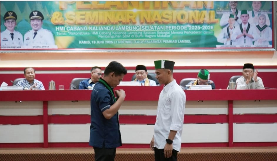 Lampung Selatan – Pengurus Himpunan Mahasiswa Indonesia (HMI) dan Kohati HMI cabang Kalianda periode tahun 2025 – 2026 resmi di lantik di Aula Rajabasa, kantor Bupati kabupaten Lampung Selatan (Lamsel). Pada Kamis, (19 /6 /2025)